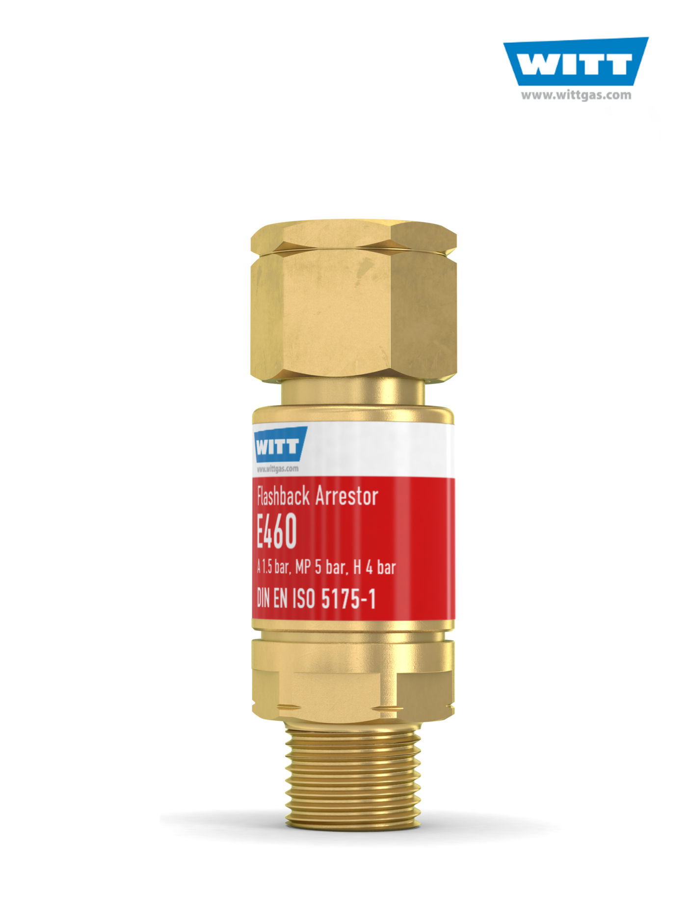 Witt-Flashback Arrestor E460-3 against reverse gas flow and flashback according EN 730-1 BAM approval: BAM/ZBA/003/04 ISO standard: 5175 Inlet: 9/16 LH AGS Outlet: 9/16 LH female MG safety elements: FA,NV acetylene: [A] 1,5 bar city gas: [C] 5,0 bar hydrogen: [H] 4,0 bar methane: [M] 5,0 bar LPG: [P] 5,0 bar MG:female tread with ball head AGS:male tread with counterbore Origin Country: Germany